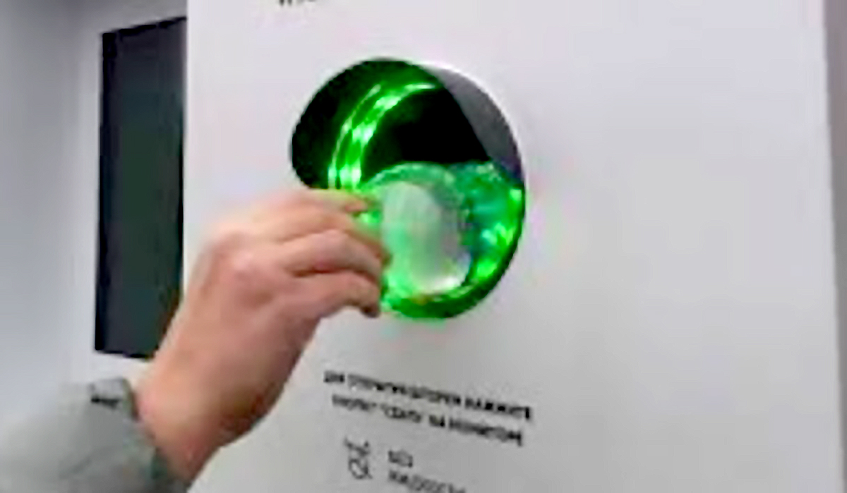 Агрегат с искусственным интеллектом принимает использованные банки, бутылки для дальнейшей их переработки.